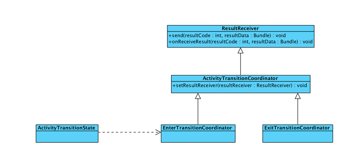ActivityTransitionCoordinator :继承自ResultReceiver,是ExitTransitionCoordinator 和 EnterTransitionCoordinator的基类,负责管理Activity的动画和Activity之间的通信