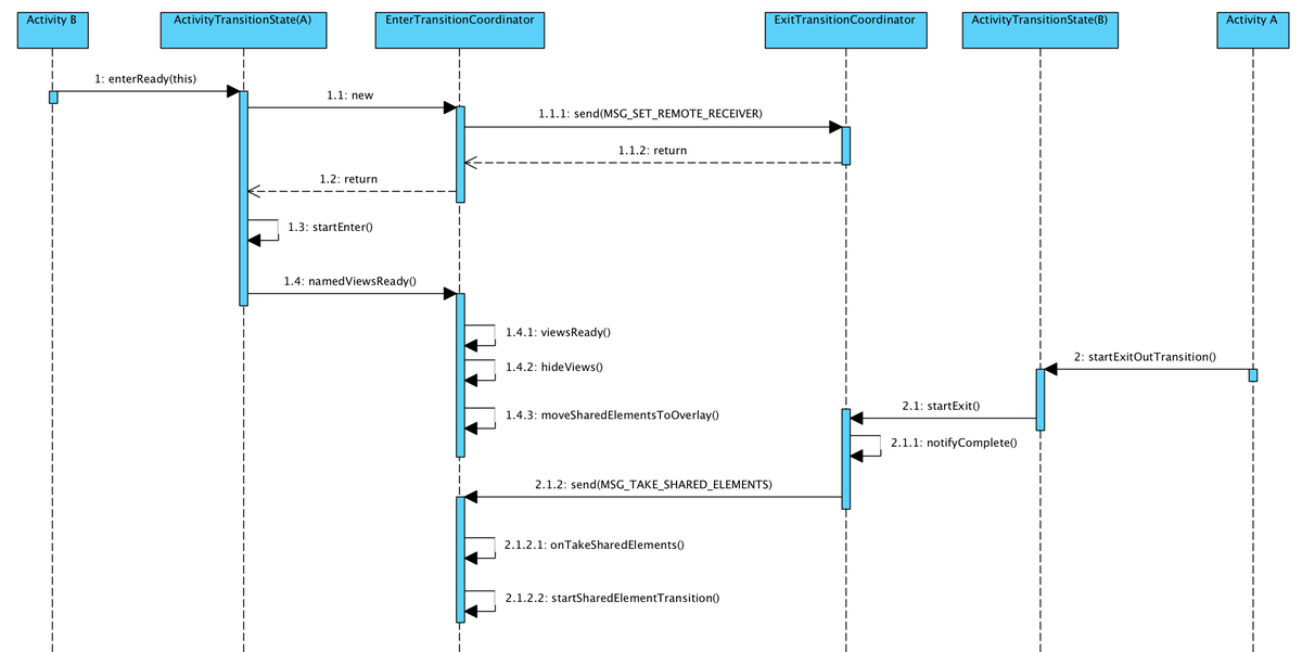 ExitTransitionCoordinator同时发送MSG_EXIT_TRANSITION_COMPLETE给EnterTransitionCoordinator,通知它可以开始EnterTransition动画(不是SharedEnterTransitino)