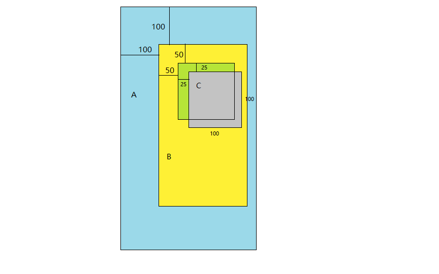 我们举个例子来说明这个方法,假设图中A代表屏幕,B为一个ViewGroup,左上角在A中的坐标为(100, 100),C长宽均为100,是B的child view,左上角在B中的坐标是(50, 50),同时C设置了transaltion,x、y均偏移25也就是图中灰色的区域(绿色区域为C的真实位置)。C的transformMatrixToGlobal方法中首先获取到Parent也就是B的Matrix,得到的是x、y偏移100的矩阵
