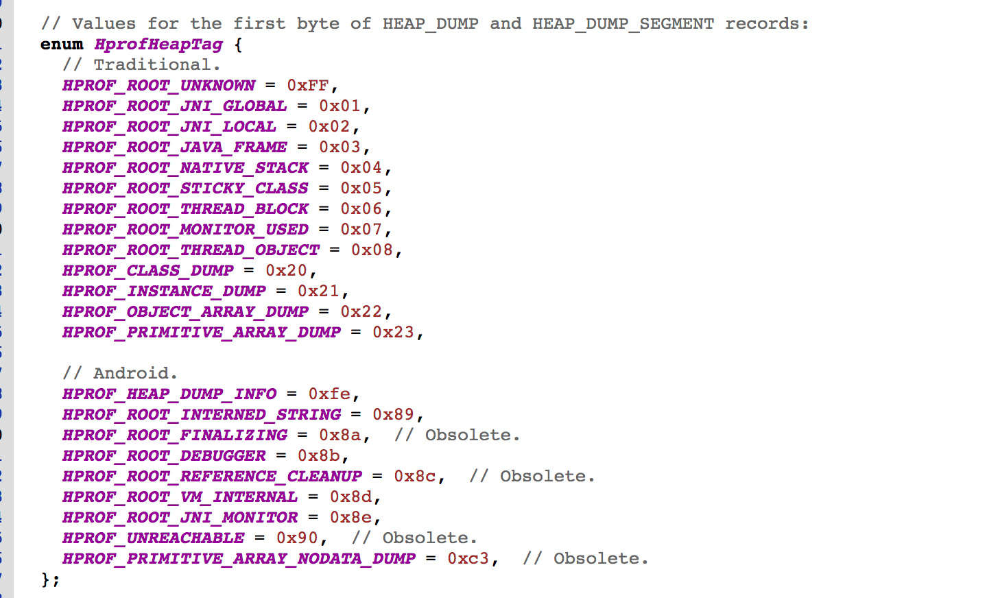 然而Android平台上的hprof文件和标准Java的hprof定义有一些区别,主要是版本号不一样,而且增加了一些特殊Tag,在art/runtime/hprof/hprof.cc中有如下定义